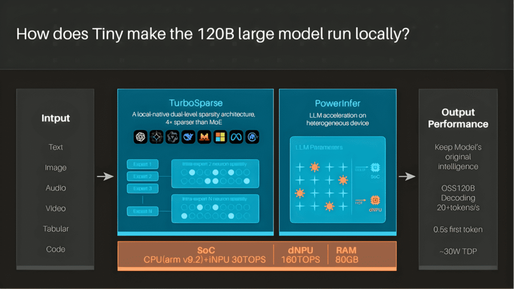 When it comes to the CPU, Tiiny’s AI New AI Pocket Lab features a new ARM v9.2-based 12-core powerful CPU. This allows this tiny AI supercomputer to run large language models (LLMs) with up to 120 billion parameters locally, without any cloud connectivity, internet, servers, or high-end GPUs. Notably, the ARM v9.2 processor used in this device provides 190 TOPS (Tera-Operations Per Second) of computing power, combining 30 TOPS from the CPU, integrated GPU, and integrated NPU (INPU) with the power of a 160 TOPS dedicated NPU (dNPU). which is why this small, mini AI supercomputer has earned so much attention.